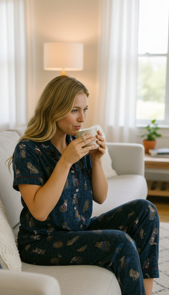 Conjunto de pijama clásico, informal y relajado, compuesto por pantalón largo y camisa manga corta elaborada en algodón 100%, tejido premium suave al tacto.
